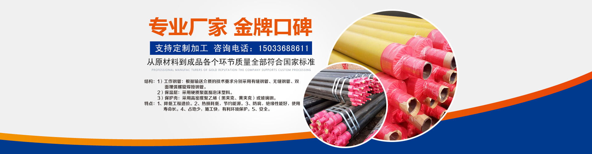 鋼套鋼直埋蒸汽保溫管又叫做管中管,鋼套管,鋼套鋼保溫管道由輸送介質的工作鋼管、玻璃棉保溫隔熱層、鋁箔反射層、不銹鋼緊固帶、滑動導向支架、空氣保溫層、外護鋼管、外防腐層 -